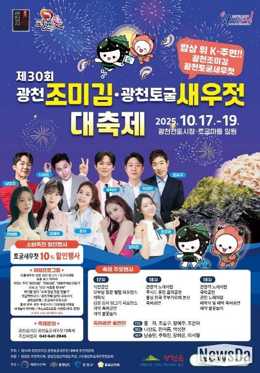 뉴스다 최광묵 기자 | 홍성군 광천읍은 오는 17일부터 19일까지 3일간 광천전통시장 및 토굴마을 일원에서 ‘제30회 광천조미김·광천토굴새우젓 대축제’의 성대한 막을 올릴 예정이라고 밝혔다.