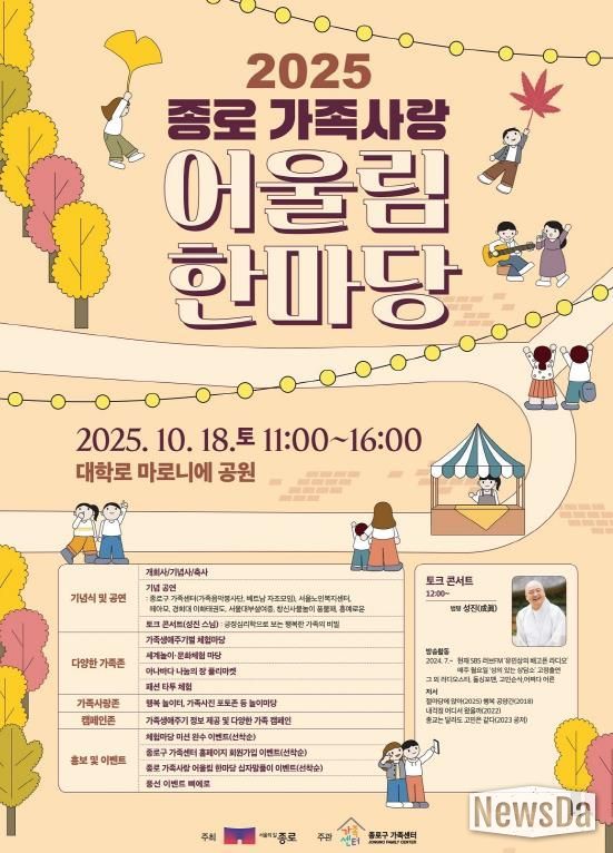뉴스다 최광묵 기자 | 종로구는 10월 18일 11시부터 16시까지 대학로 마로니에공원에서 '2025 종로 가족사랑 어울림한마당'을 개최한다.