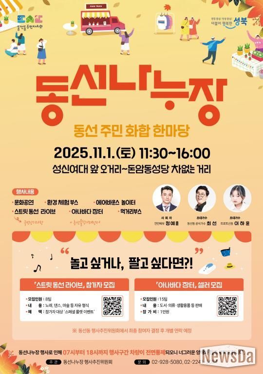 뉴스다 최광묵 기자 | 서울 성북구는 오는 11월 1일 오전 11시 30분부터 오후 4시까지, 성신여대 앞 오거리에서 돈암동성당 구간까지 이어지는 거리에서 ‘2025년 차 없는 거리 동선나누장’ 행사를 개최한다고 밝혔다.