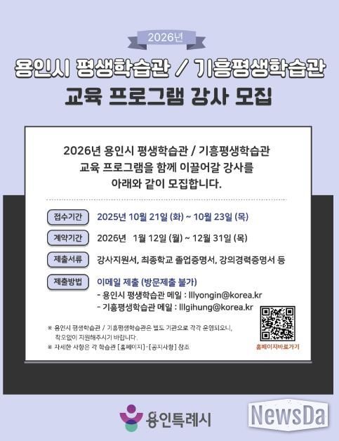 뉴스다 최광묵 기자 | 용인특례시는 21일부터 23일까지 3일간 ‘2026년 평생학습관 프로그램’을 운영할 강사를 모집한다고 15일 밝혔다.