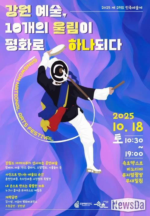 뉴스다 최광묵 기자 | (사)강원민예총과 (사)강원민예총 속초지부에서 주최하고 강원특별자치도, 속초시가 후원하는 ‘2025 제29회 강원민족예술제’가 오는 10월 18일, 피노디아 야외공연장에서 열린다.