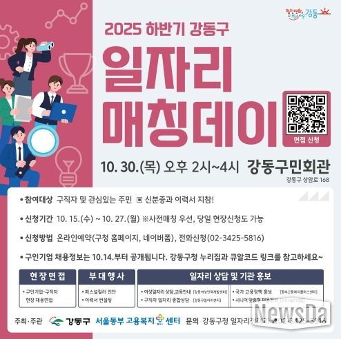 뉴스다 최광묵 기자 | 강동구는 오는 10월 30일 강동구민회관에서 구직자와 지역 기업 간 채용 연계를 위한 ‘일자리 매칭데이’를 개최한다고 밝혔다.