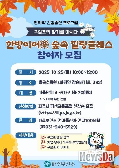 뉴스다 최광묵 기자 | 파주보건소는 시민들의 건강한 삶을 위한 한의약 건강 증진 프로그램인 ‘한방이어락(樂) 숲속 치유교실(힐링 클래스)’을 오는 25일 10시부터 12시까지 율곡수목원에서 운영한다.
