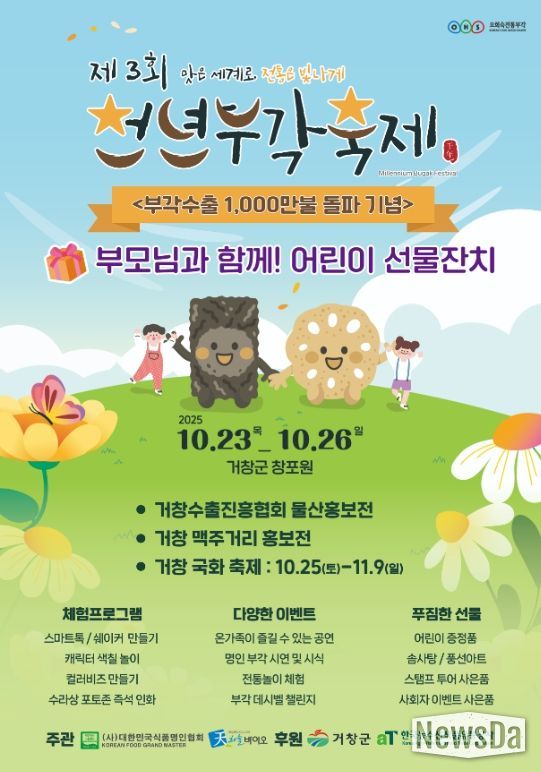 한국 전통 스낵 ‘부각’을 주제로 전시·체험·공연이 어우러진 산업·문화 융합형 축제로, 남녀노소 누구나 무료로 즐길 수 있다. 이번에는 사단법인 대한민국식품명인협회와 ㈜하늘바이오농업회사법인이 공동 주관하고, 거창군과 한국농수산식품유통공사(aT)가 후원한다.