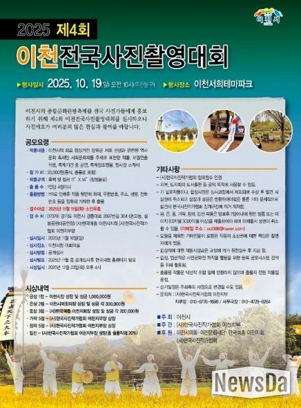 뉴스다 최광묵 기자 | 이천시가 주최하고 (사)한국사진작가협회 이천지부가 주관하는 제4회 이천전국사진촬영대회가 장위공 서희외교문화제와 함께 오는 10월 19일 서희테마파크에서 개최된다.