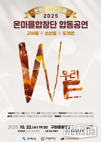 뉴스다 최광묵 기자 | 구미문화재단은 ‘문화가 있는 마을’ 사업의 일환으로 운영 중인 온마을합창단의 합동공연을 오는 10월 22일 오후 7시 30분 구미문화예술회관 대공연장에서 개최한다고 밝혔다.