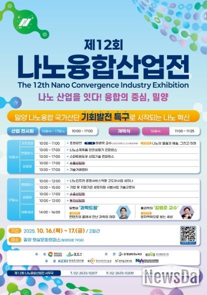 뉴스다 최광묵 기자 | 경상남도는 오는 16일부터 17일까지 이틀간 밀양햇살문화캠퍼스에서 ‘나노산업을 잇다! 융합의 중심, 밀양’을 주제로 제12회 나노융합산업전(나노피아 2025)을 개최한다고 밝혔다.