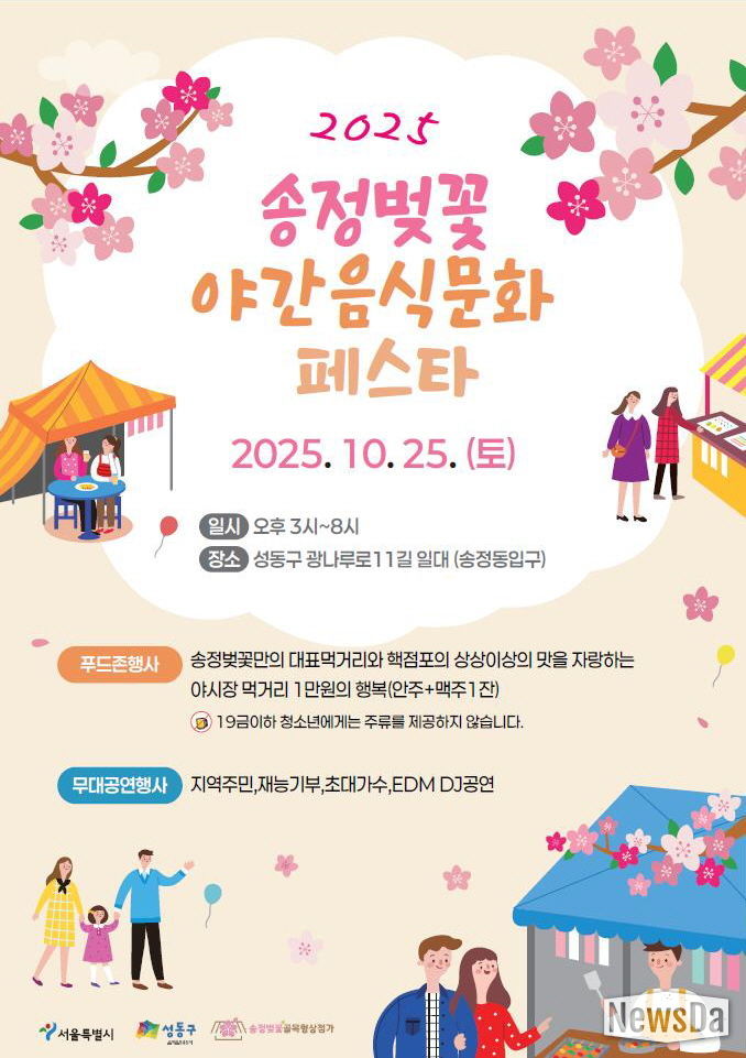 오는 10월 25일(토) 오후 3시부터 8시까지 서울 성동구 광나루로11길 일대(송정동, 송정벚꽃골목형상점가)에서 ‘2025 송정벚꽃야간음식문화페스타’가 펼쳐진다.