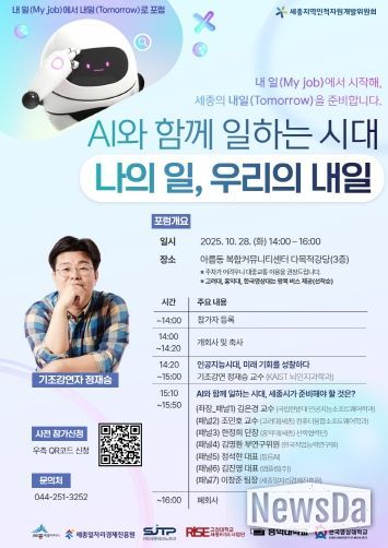뉴스다 최광묵 기자 | 세종일자리경제진흥원이 고려대학교(세종), 홍익대학교(세종), 한국영상대학교와 함께 오는 28일 오후 2시, 아름동 복합커뮤니티센터 다목적강당에서 ‘내 일(My Job)에서 내일(Tomorrow)로 포럼’을 개최한다.