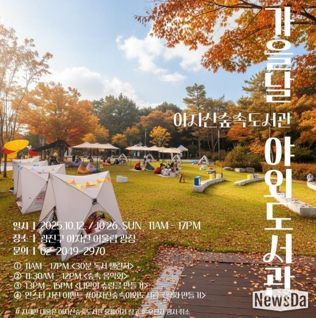 26일에는 아차산어울림광장에서 ‘가을날 야외도서관’이 운영된다. 오전 11시부터 오후 5시까지 진행되는 이번 행사는 사서 추천 도서 약 500여 권과 함께 다채로운 도서관 콘텐츠로 꾸며진다.
