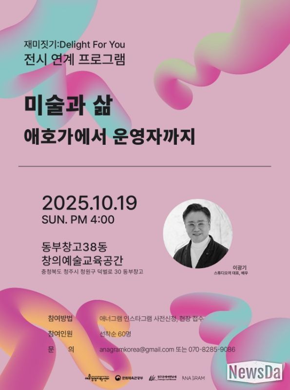 이번 강연은 2025 청주공예비엔날레에서 만나는 신진작가 전시 ‘재미 짓기 : Delight for you(이하, 재미 짓기)’와 연계한 프로그램으로, 미술 애호가에서 아트 스튜디오의 운영자로 예술을 통해 삶의 재미를 풍성하게 지어온 배우 이광기 씨의 세상을 엿보는 기회다.