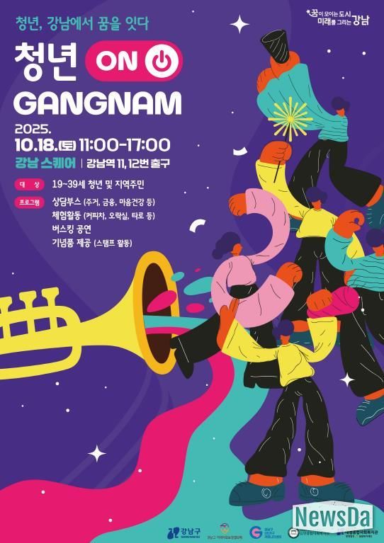 뉴스다 최광묵 기자 | 꿈이 모이는 도시, 미래를 그리는 강남구가 오는 10월 18일 오전 11시부터 오후 5시까지 강남역 11번·12번 출구 앞 강남스퀘어에서 ‘청년 고독사 예방 거리 캠페인, 청년 ON 강남’ 행사를 개최한다. 이번 행사는 사회적 고립을 겪는 청년 문제에 대한 인식을 확산하고, 강남구의 청년 대상 정책과 지원 서비스를 보다 많은 이들에게 알리기 위한 취지로 기획됐다.
