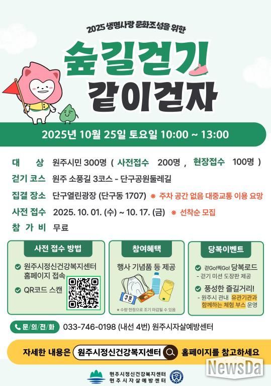 뉴스다 최광묵 기자 | 원주시정신건강복지센터 부설 자살예방센터는 오는 25일 오전 10시, 단구공원 둘레길에서 생명사랑 문화조성을 위한 숲길걷기 ‘같이 걷자’를 개최한다.