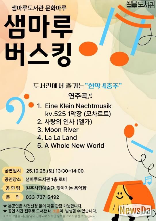 뉴스다 최광묵 기자 | 샘마루도서관은 오는 25일 도서관 로비에서 ‘샘마루버스킹-현악 4중주’ 공연을 개최한다.