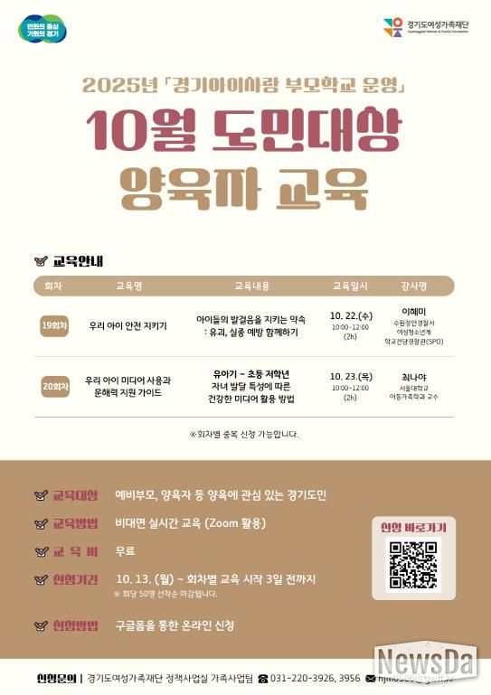 한편 이번 교육은 재단이 경기도 위탁으로 운영하는 ‘2025년 경기아이사랑부모학교’ 사업의 하나로 마련됐다. ‘경기아이사랑부모학교’는 경기도가 건강한 양육 문화 확산을 목표로 도민에게 체계적인 양육자 교육과 1:1 맞춤형 양육상담을 제공하는 사업이다.