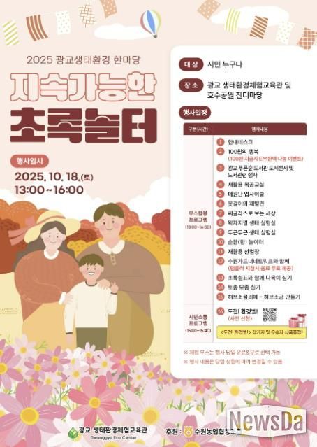 뉴스다 최광묵 기자 | 수원특례시는 10월 18일 오후 1시부터 4시까지 광교호수공원 광교생태환경체험교육관 앞 잔디마당에서 ‘2025 광교생태환경한마당–지속가능한 초록놀터’를 연다.
