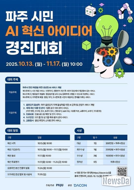뉴스다 최광묵 기자 | 파주시는 10월 13일부터 11월 17일까지 시민이 직접 참여하는 ‘파주 시민 인공지능(AI) 혁신 아이디어 경진대회’를 개최한다고 밝혔다.