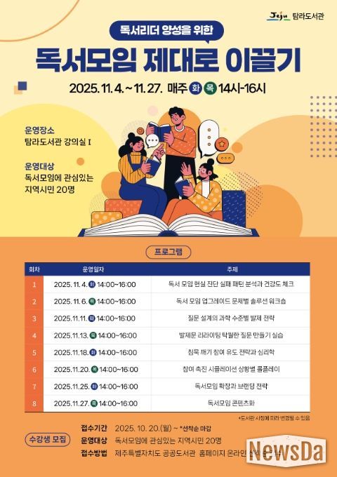 뉴스다 최광묵 기자 | 제주시 탐라도서관은 독서 리더 양성과 독서 문화 확산을 위해 ‘독서모임 제대로 이끌기’ 강좌를 운영한다.