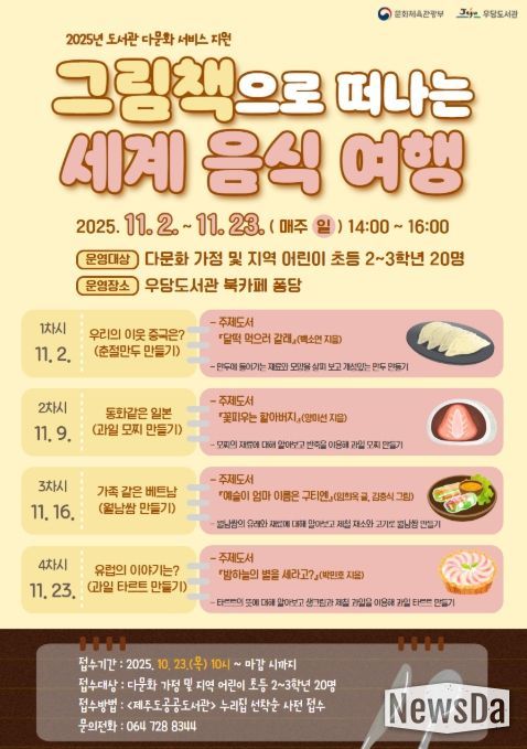 뉴스다 최광묵 기자 | 제주시 우당도서관은 2025년 도서관 다문화 서비스 지원 사업인 ‘그림책으로 떠나는 세계 음식 여행’ 프로그램 참여자를 10월 23일부터 선착순 모집한다.