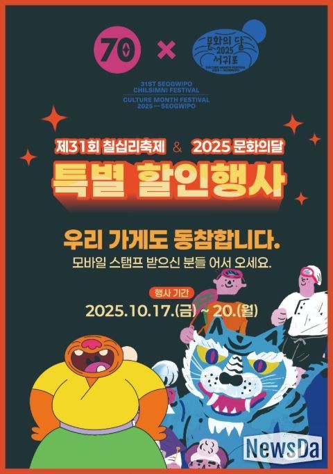 뉴스다 최광묵 기자 | 서귀포시는 ‘제31회 서귀포칠십리축제 & 2025 문화의달 행사’를 맞아 지역 상권 활성화를 위한 다양한 연계 이벤트를 운영한다고 밝혔다.
