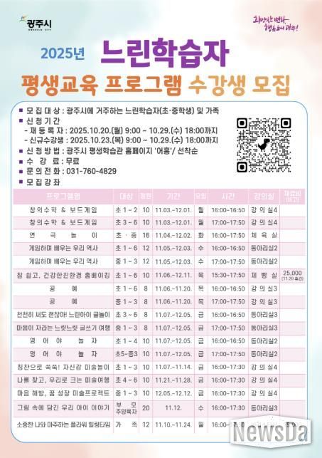 뉴스다 최광묵 기자 | 광주시는 느린 학습자 초·중등학생과 그 가족을 대상으로 맞춤형 평생교육 프로그램을 운영한다고 17일 밝혔다.