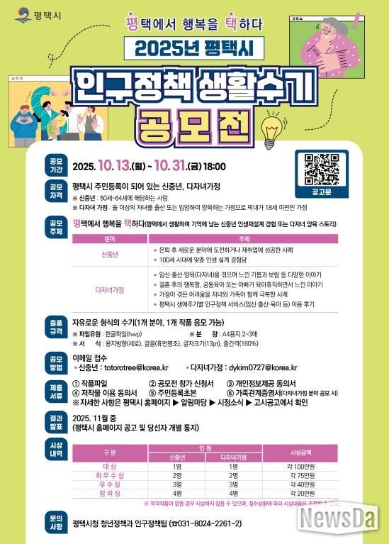 뉴스다 최광묵 기자 | 평택시는 2025년 평택시 인구정책 생활수기 공모전 ‘평택에서 행복을 택하다’를 오는 10월 31일까지 개최한다고 밝혔다.