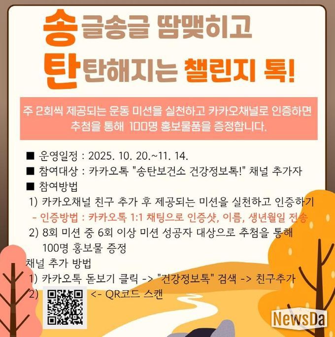 뉴스다 최광묵 기자 | 평택시 송탄보건소는 10월 20일부터 11월 14일까지 카카오톡을 활용한 ‘(송)글송글 땀 맺히고 (탄)탄해지는 챌린지 톡!’을 운영할 예정이라고 밝혔다.