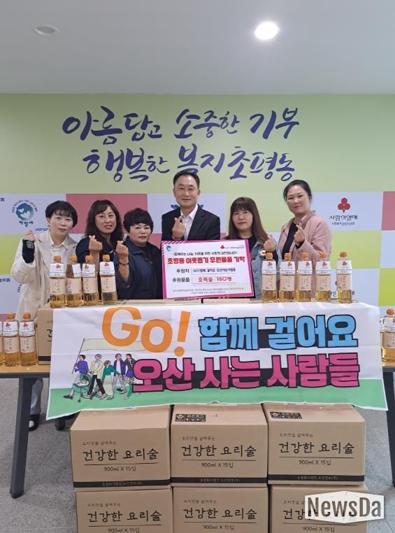 뉴스다 최광묵 기자 | 오산시 초평동은 지난 16일 시민 걷기단체 ‘GO! 함께 걸어요 오산 사는 사람들’(리더 고찬영)로부터 요리술 150병(약 50만 원 상당)을 기탁받았다고 밝혔다.