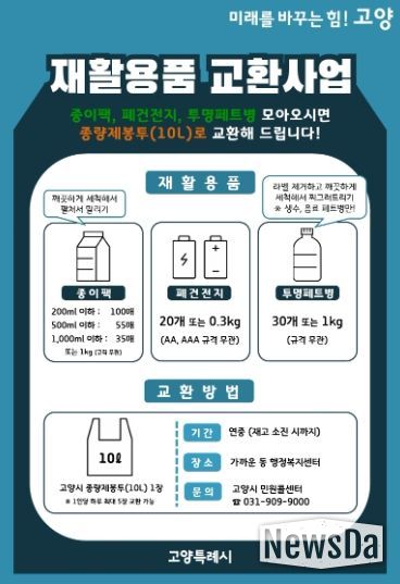 뉴스다 최광묵 기자 | 고양특례시가 2회 추가경정예산을 통해 2천만 원을 확보해 시민들의 호응 속에 추진 중인 재활용품 교환사업을 계속 이어간다.
