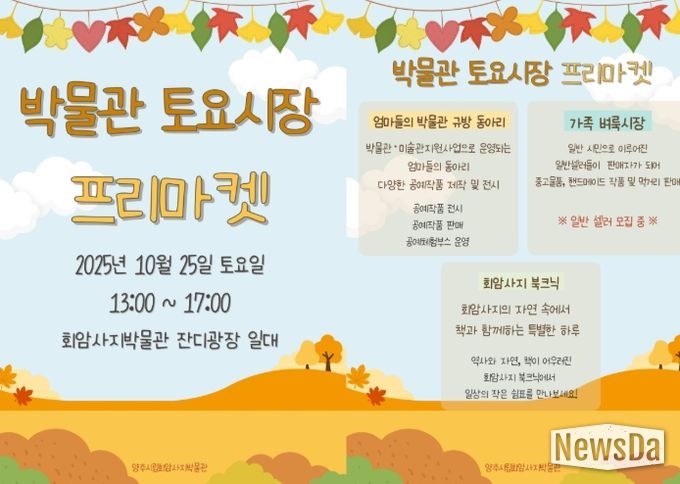 뉴스다 최광묵 기자 | 양주시립회암사지박물관이 오는 25일 오후 1시부터 5시까지 가을을 맞아 “박물관 토요시장” 프리마켓을 운영한다.