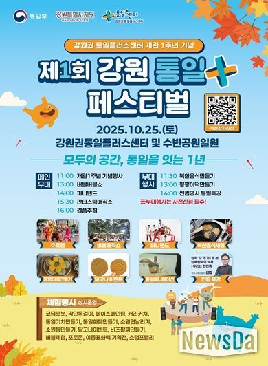 뉴스다 최광묵 기자 | 강원특별자치도는 오는 10월 25일 오전 10시 30분, 춘천 삼천동 강원권 통일플러스센터 및 수변공원 일원에서 센터 개관 1주년을 기념한 '통일플러스페스티벌'을 개최한다고 밝혔다.