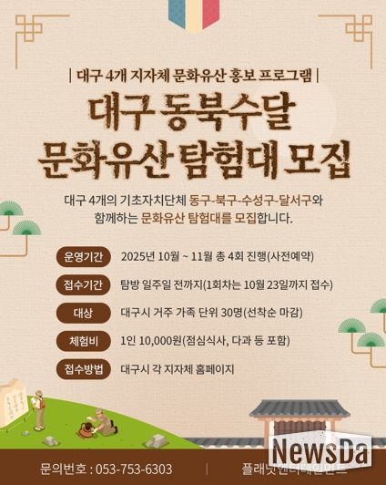 뉴스다 최광묵 기자 | 대구 수성구, 동구, 북구, 달서구가 협력해 지역의 역사와 문화를 함께 배우고 체험하는 ‘대구 문화유산 탐험대’ 운영을 시작한다.