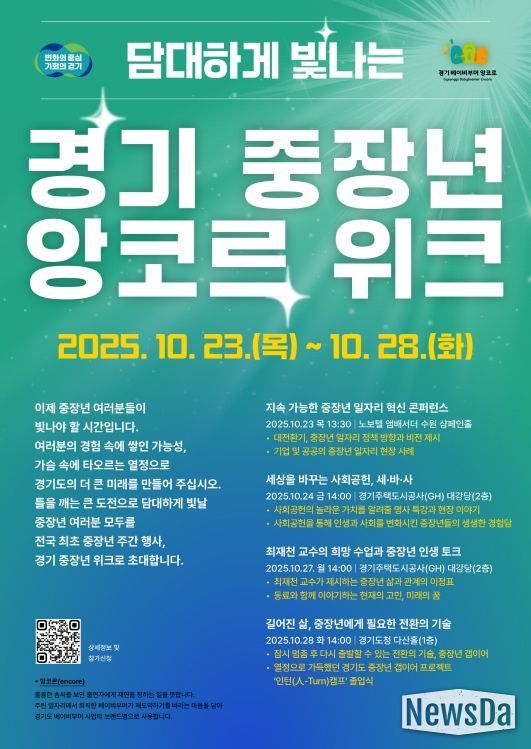 뉴스다 최광묵 기자 | 경기도가 중장년 세대의 도약과 성장을 지원하기 위해 23일부터 28일까지 6일간 ‘경기 중장년 앙코르 위크(week)’을 개최한다.