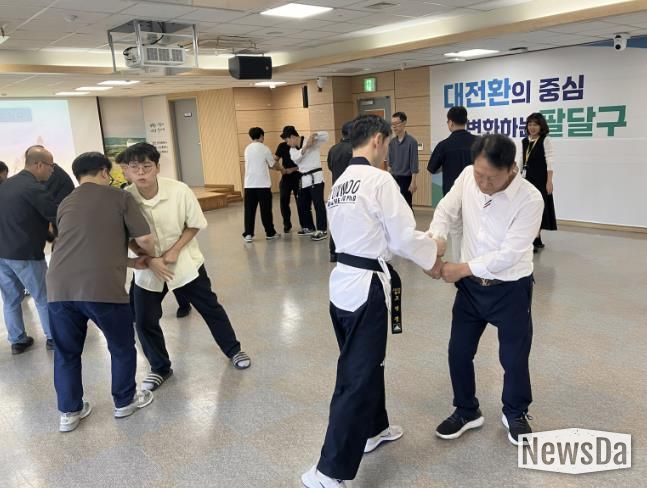 뉴스다 최광묵 기자 | 수원시 팔달구는 공공청사 내 각종 폭력 및 테러에 대응하기 위해 지난 17일 SOS팔달안전봉사단과 구·동 공직자를 대상으로 구청 대회의실에서 호신술 실습 등 범죄예방 교육을 실시했다.