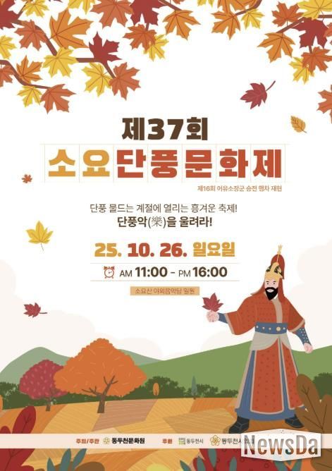뉴스다 최광묵 기자 | 동두천시 소요산 야외음악당 일원에서 오는 10월 26일 오전 11시부터 동두천문화원이 주최하고 동두천시가 후원하는‘제37회 소요단풍문화제 및 제16회 어유소장군 행차 재현’이 열린다.