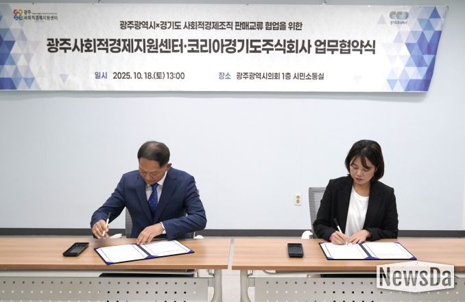 뉴스다 최광묵 기자 | 경기도주식회사와 광주광역시 사회적경제지원센터가 지난 18일 광주광역시 시의회에서 ‘경기도-광주광역시 사회적경제조직 판매교류 협업을 위한 업무협약’을 체결하고 사회적경제조직 활성화를 위해 공동 노력하기로 했다.