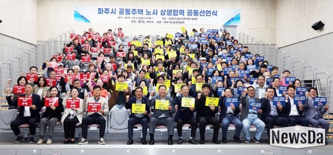 뉴스다 최광묵 기자 | 아파트 경비원, 미화원 등 공동주택 노동자들의 초단기 계약 관행을 근절하기 위해 경기도와 파주시, 지난 17일 파주시 운정 다누림 노인복지관에서 ‘공동주택 노동자 상생 협력 선언식’을 개최했다.