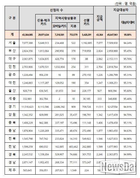 뉴스다 최광묵 기자 | 2차 민생회복 소비쿠폰 신청·지급 개시 이후 4주간(9.22(월)~10.19(일)) 지급대상자의 95.0%인 4천336만 명이 신청하고 4조 3천364억 원이 지급되어, 추석 연휴 간 오프라인 신청이 불가능했음에도 불구하고, 대다수 국민들이 소비쿠폰을 신청·지급받은 것으로 나타났다.(10.19. 24시 기준)