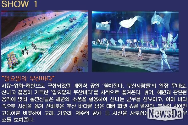'쇼(Show) 1'에서는 '일요일의 부산바다'를 주제로 군무와 대형 '퍼펫 쇼(인형극)'를 선보인다.