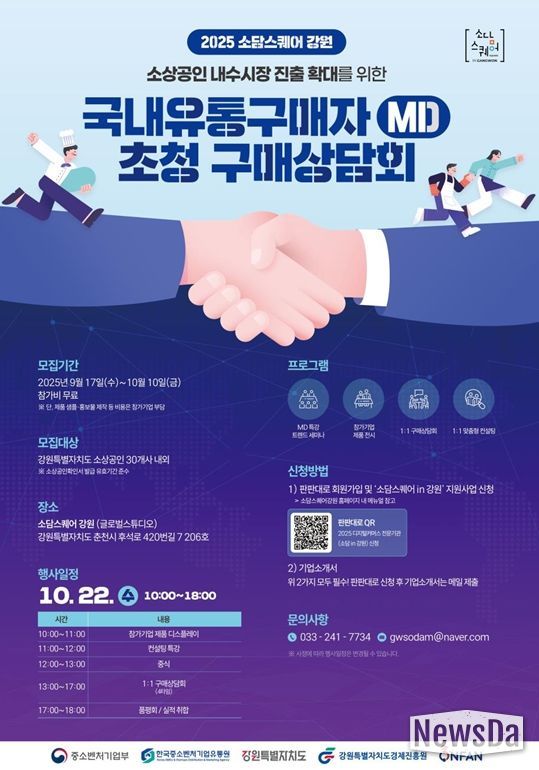 뉴스다 최광묵 기자 | 강원특별자치도와 강원특별자치도경제진흥원은 10월 22일, '소담스퀘어 인(in) 강원'에서 도내 소상공인을 대상으로 ‘2025 소담스퀘어 강원 엠디(MD)초청 구매상담회’를 개최한다.