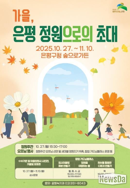 뉴스다 최광묵 기자 | 서울 은평구는 오는 27일 은평구청 앞 숲으로가든에서 ‘가을, 은평 정원으로의 초대’를 주제로 정원주간 개막식을 연다고 밝혔다. 이번 행사를 시작으로 오는 27일부터 내달 10일까지 2주간 정원문화 확산을 위한 ‘정원주간’이 이어진다.