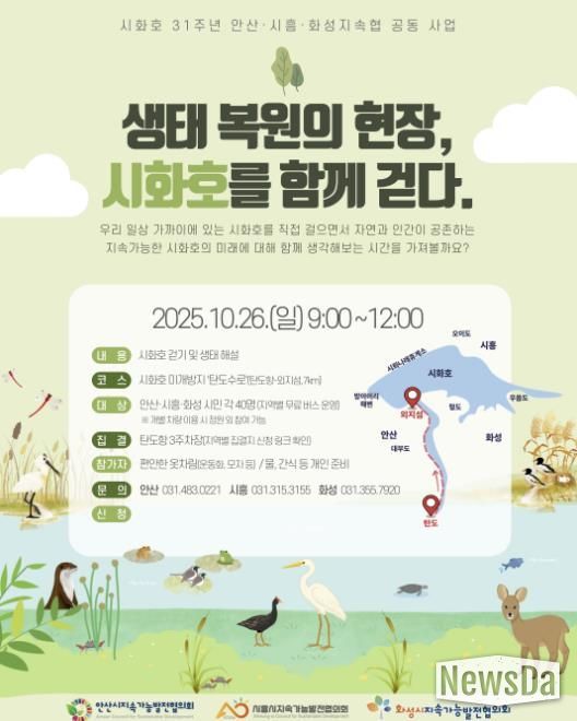 뉴스다 최광묵 기자 | 시흥ㆍ안산ㆍ화성 지속가능발전협의회는 시화호를 함께 품고 있는 세 개 도시의 공동 사업으로, 시화호 담수화 중단 31주년을 맞아 오는 10월 26일 오전 9시부터 ‘생태복원의 현장, 시화호를 함께 걷다’ 행사를 탄도수로(탄도항~외지섬)에서 개최한다.