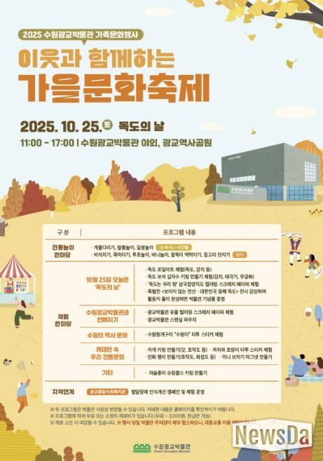 뉴스다 최광묵 기자 | 수원광교박물관은 독도의 날인 10월 25일 오전 11시부터 오후 5시까지 수원광교박물관 야외(광교역사공원)에서 ‘2025 수원광교박물관 가족문화행사–이웃과 함께하는 가을문화축제’를 연다.