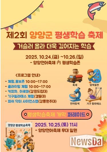 뉴스다 최광묵 기자 | 양양군은 오는 10월 24일부터 26일까지 3일간, 양양연어축제 행사장(남대천 둔치)내 ‘평생학습축제 존’에서 ‘제2회 양양군 평생학습축제’를 개최한다.