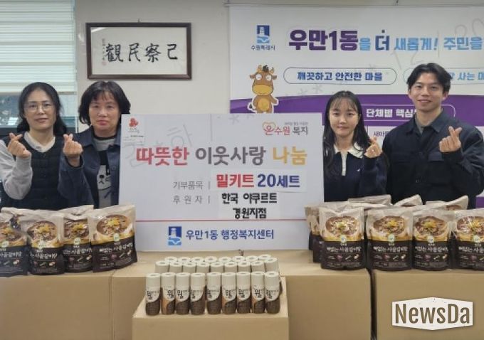 뉴스다 최광묵 기자 | 수원시 팔달구 우만1동 행정복지센터는 지난 20일, 한국야쿠르트 경원지점으로부터 갈비탕, 소불고기떡볶이, 발효유 등 다양한 즉석조리식품을 전달받았다. 이번 후원은 지역 내 어려운 이웃들에게 따뜻한 마음을 전하고자 마련된 것으로, 전달된 물품은 취약계층 가정에 소중히 전달될 예정이다.