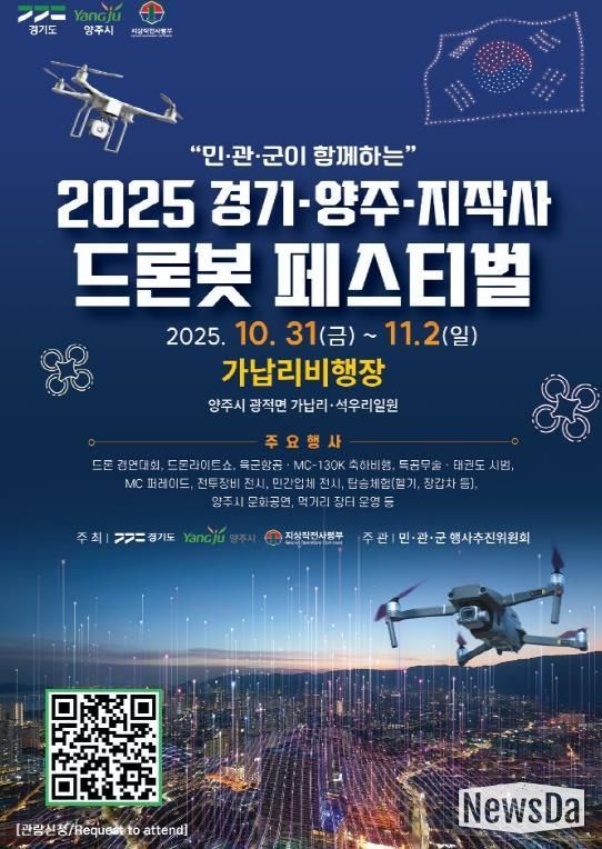 뉴스다 최광묵 기자 | 경기도와 양주시, 지상작전사령부가 오는 31일부터 11월 2일까지 3일간 가납리비행장 일원에서 '2025 경기ㆍ양주ㆍ지작사 드론봇 페스티벌'을 개최한다.