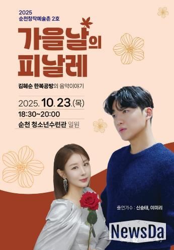 뉴스다 최광묵 기자 | 순천문화재단이 운영 중인 순천창작예술촌 2호 ‘김혜순 한복공방’에서는 오는 23일 오후 7시, 가을 감성을 담은 음악 공연 「가을날의 피날레」(부제: 김혜순 한복공방의 음악 이야기)를 순천시 청소년 수련관 야외무대(순천시 금곡길 20)에서 개최한다고 밝혔다.