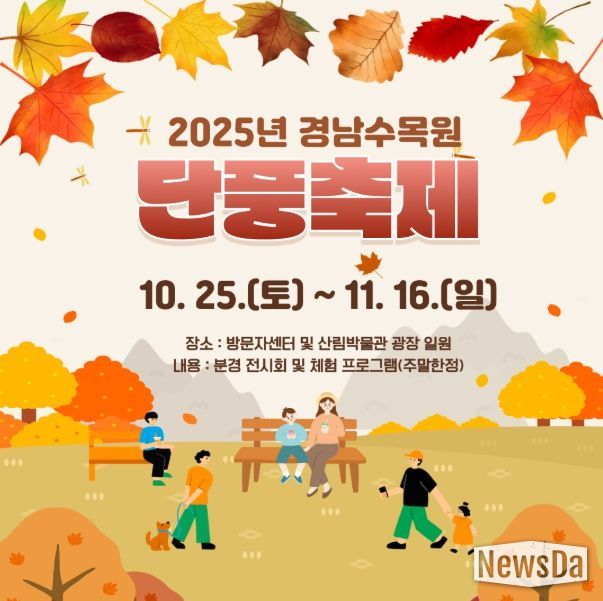 뉴스다 최광묵 기자 | 경상남도수목원에서는 오는 10월 25일부터 11월 16일까지 깊어 가는 가을, 단풍이 절정을 이루는 시기에 맞춰 ‘2025년 경상남도수목원 단풍축제’를 개최한다고 밝혔다.