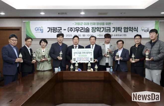 뉴스다 최광묵 기자 | 가평군은 ㈜우리술과 지역 인재양성을 위한 장학기금 기탁 재협약을 20일 체결했다고 밝혔다.