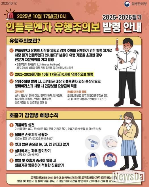 질병관리청은 인플루엔자(독감) 환자 수가 급격히 증가함에 따라, 지난 17일 0시부터 ‘인플루엔자 유행주의보’를 발령했다.